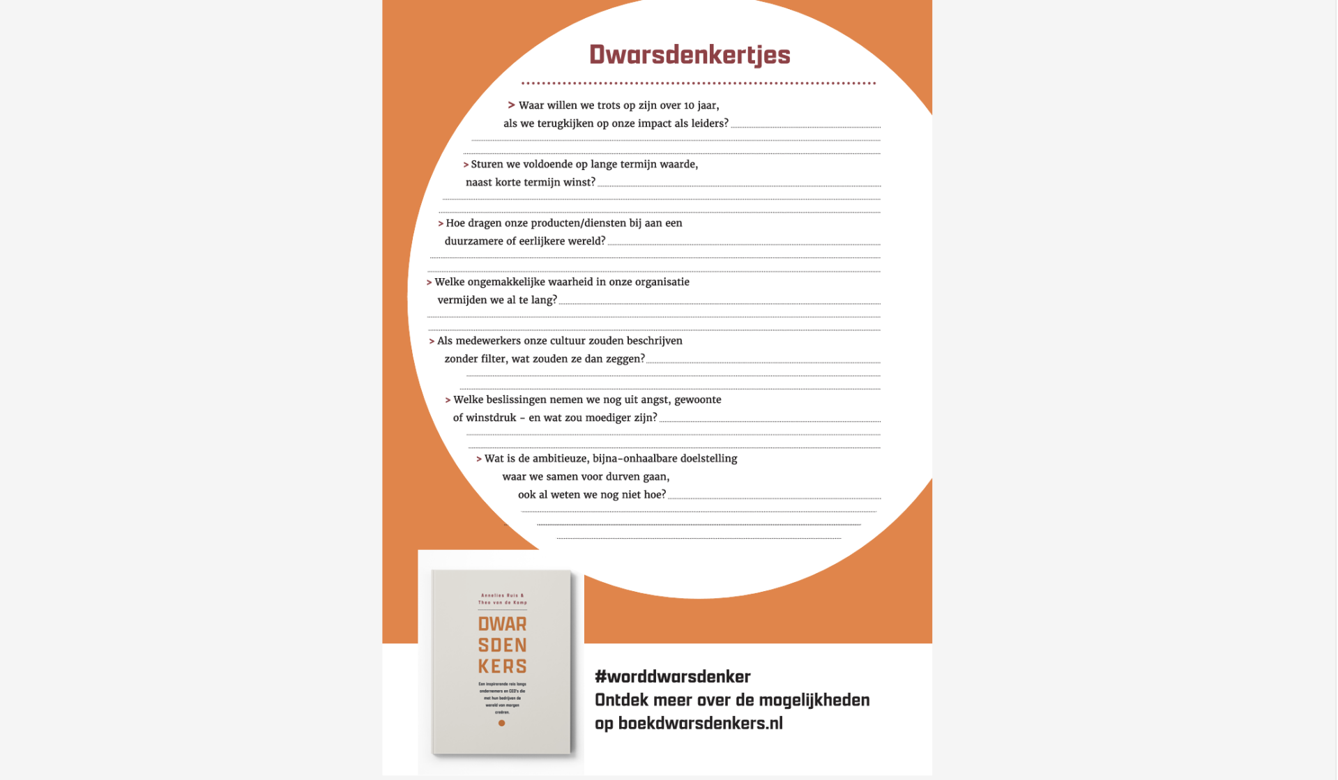 Het boek 'Dwarsdenkers' is geen eindpunt, maar een begin. Het nodigt jou uit om mee te doen en zélf Dwarsdenker te worden. Want de toekomst is voor hen die durven af te wijken, te vernieuwen en verantwoordelijkheid te nemen. Samen bouwen we aan ondernemerschap dat de wereld vooruithelpt.